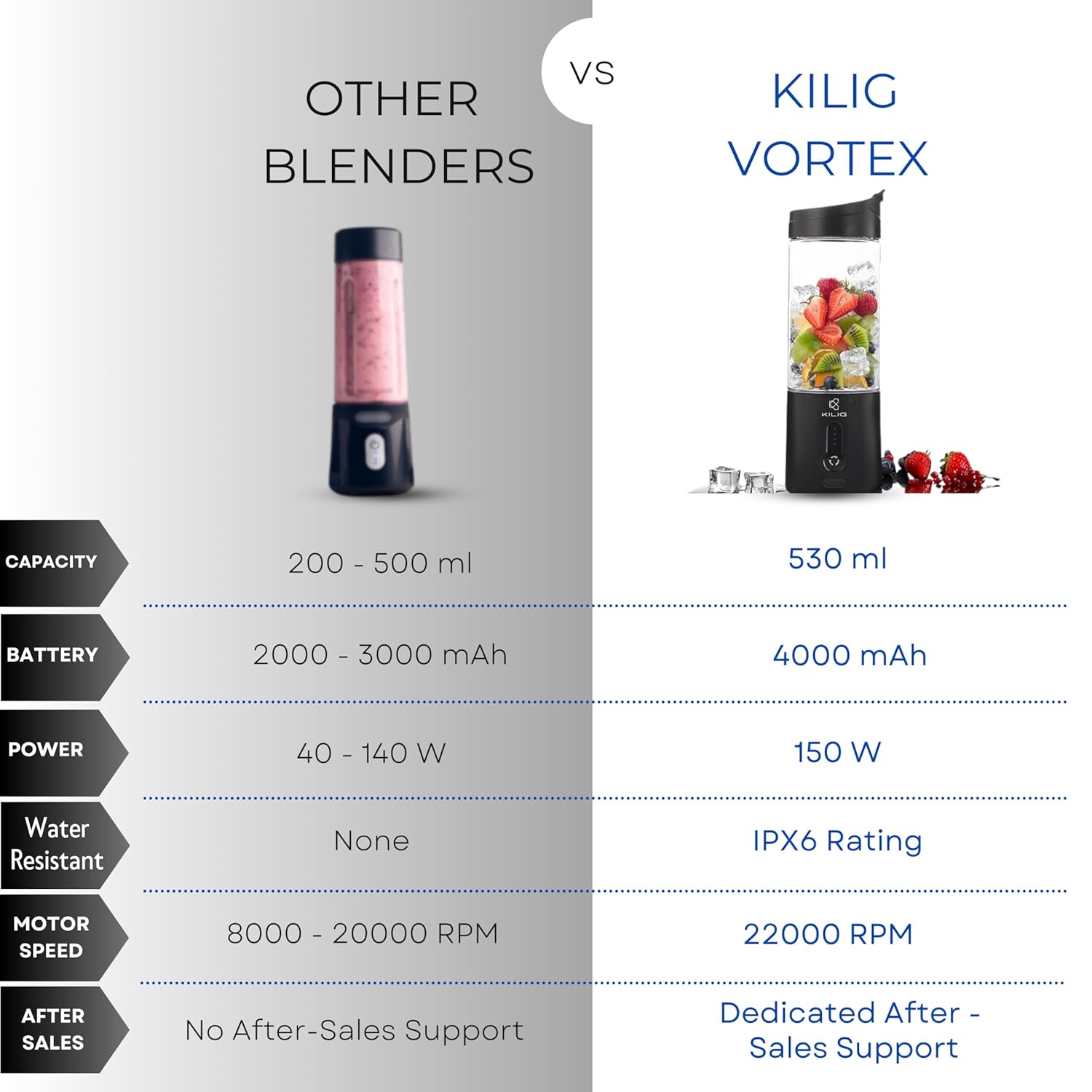 Equipped with a 150W motor running at 22,000 RPM and 6-sided food-grade 304 stainless steel blades, the Kilig Vortex effortlessly crushes fruits, vegetables, and even ice—delivering smooth, consistent blends in seconds.