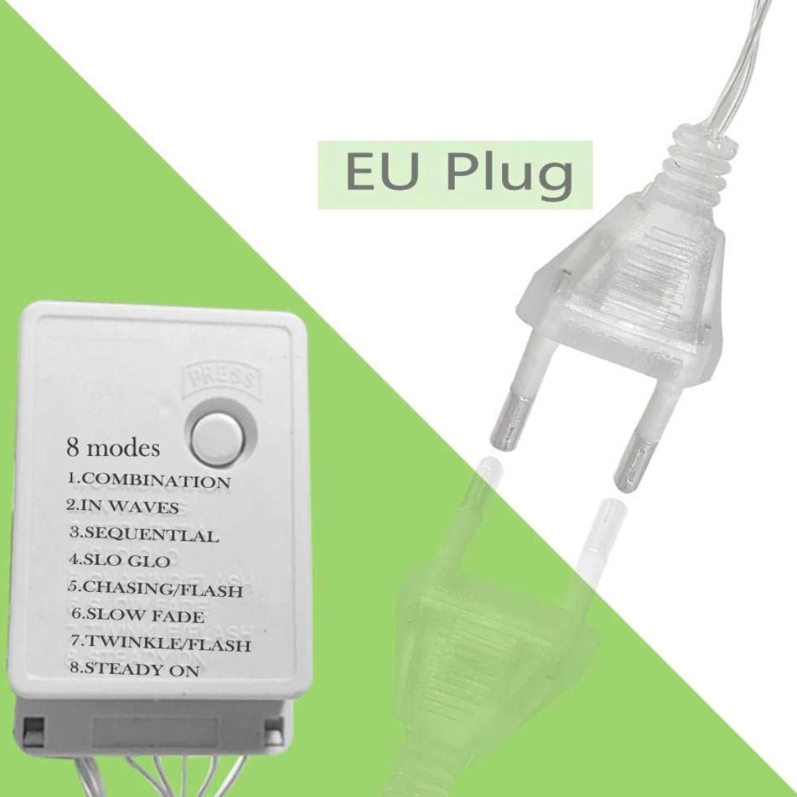 8 mode settings: Namely; combination, waves, sequential, Slo-Glo, chasing/flash, slow fade, twinkle/flash and steady on.